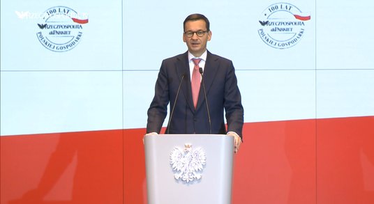 Gości wita redaktor Michał Niewiadomski. Powitał gości honorowych, premiera Mateusza Morawieckiego. Adama Bielana, wicemarszałka senatu, Joannę Kopcińską i Marka Suskiego z Kancelarii Premiera, Pawła Borysa, prezesa PFR.