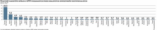 Na rynku głównym GPW notowanych jest 410 spółek, w tym 368 krajowych. Ich łączna kapitalizacja wynosi 758 mld zł. Około 100 mld zł z tej kwoty przypada na pakiety kontrolowane przez Skarb Państwa. To niezmiennie największy akcjonariusz na naszej giełdzie. W pierwszej dziesiątce dominują krajowe instytucje, w tym OFE. Ale znajdziemy też jednego inwestora indywidualnego, który z pakietem wartym ponad 22 mld zł otwiera listę największych giełdowych rekinów.