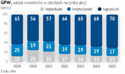Nie byłoby sukcesu polskiego rynku kapitałowego, gdyby nie inwestorzy indywidualni. To oni w pierwszych latach wykazywali największą aktywność rynkową. Z dzisiejszej perspektywy może to brzmieć wręcz niewiarygodnie. Od wielu lat główną siłą napędową naszego rynku są przecież inwestorzy zagraniczni. W 2025 r. odpowiadali za 70 proc. obrotów na głównym rynku akcji, podczas gdy klienci detaliczni wygenerowali „jedynie” 13 proc. obrotów. Rynek się zmienił, a wraz z nim struktura inwestorów, a to pewnie też jeszcze nie jest koniec.
