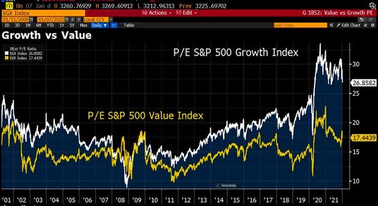 Premia z wyceny akcji wzrostowych nad akcjami wartościowymi jest obecnie wyższa niż kiedykolwiek od przełomu tysiącleci. Podczas gdy wzrostowe akcje w indeksie wzrostu S&P 500 są wyceniane według średniego wskaźnika P/E na poziomie 27, średni wskaźnik P/E indeksu wartości S&P 500 wynosi zaledwie 17,5.