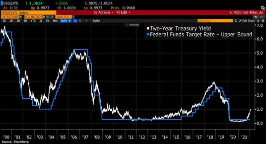Z kolei rentowność 2-letnich amerykańskich obligacji skarbowych po raz pierwszy od lutego 2020 r. wzrosła powyżej 1,0 proc., o 3,9 pb do 1,006 proc., podczas gdy rentowność 20-letnich obligacji skarbowych wzrosła o 3,3 pb do 2,208 proc., najwyższa od czerwca 2021 r.
