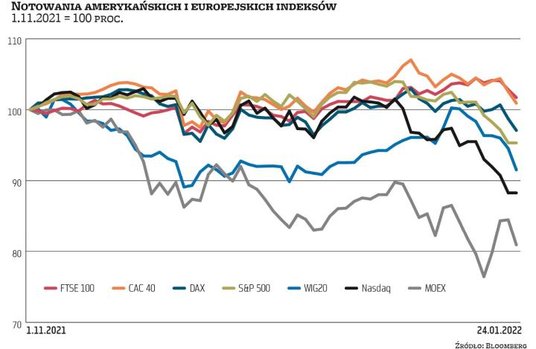 Większość europejskich indeksów kontynuowała w poniedziałek przecenę. Francuski CAC 40 czy niemiecki DAX spadały po około 4 proc. Widmo konfliktu na linii Moskwa–Kijów powodowało, że rosyjski MOEX spadał o około 8 proc. Pod silną presją były również inne indeksy z rynków wschodzących, w tym z GPW. WIG20 pod koniec sesji spadał o ponad 5 proc., schodząc w okolice 2150 pkt. Była to już ósma spadkowa sesja z rzędu, a stopa zwrotu, licząc od początku roku, jest już ujemna.