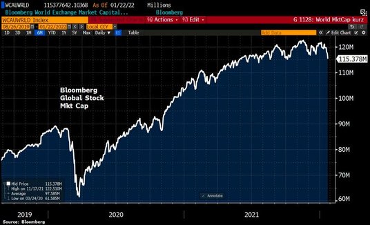 Światowe akcje straciły w tym tygodniu 4,2 bln USD kapitalizacji, najwięcej od października 2020 r. w związku ze spadkami firm technologicznych i reakcją inwestorów na sygnały, że może spowolnić wzrost niektórych akcji wartościowych, w które inwestowali na początku tego roku. Globalne akcje warte obecnie 136 proc. światowego PKB, wobec 144 proc. w grudniu.