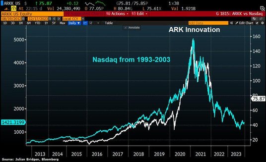 W analizie Grantham zawarł wiele dowodów. Pierwsza oznaka kłopotów, na którą wskazuje, pojawiła się w lutym ubiegłego roku, kiedy dziesiątki najbardziej spekulacyjnych akcji zaczęły spadać. Fundusz Cathie Wood's Ark Innovation ETF spadł od tego czasu o 52 proc. Następnie Russell 2000, indeks akcji spółek o średniej kapitalizacji, który zazwyczaj radzi sobie lepiej podczas hossy, dogonił S&P 500 w 2021 roku. Wreszcie pojawiło się coś, co Grantham nazywa „szalonym zachowaniem inwestorów", wskazującym na późną bańkę: akcje memów, szał zakupów producentów pojazdów elektrycznych, wzrost bezsensownych kryptowalut, takich jak dogecoin i wielomilionowe ceny - tokeny zamienne lub NFT.
