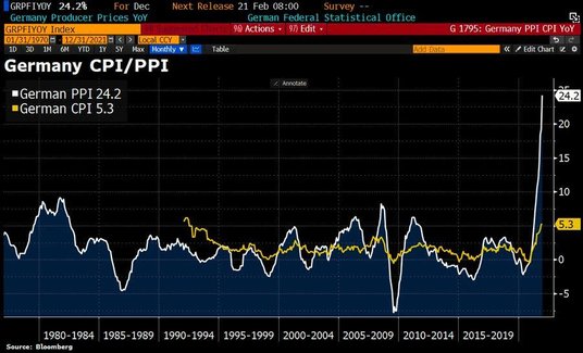 Niemiecki PPI podskoczył w grudniu o 24,2 proc. r/r, przebijając wszelkie prognozy. W porównaniu z listopadem indeks wzrósł o 5 proc. To ogromny wzrost cen producentów, przy czym roczny skok był najwyższy od czasu rozpoczęcia badania w 1949 r. Skok cen energii przyczynił się do dużego wzrostu, a jej ceny wzrosły średnio o 69 proc. w grudniu w porównaniu z listopadem. Bez energii ceny producentów były nadal o około 10,4 proc. wyższe w porównaniu do grudnia 2020 roku.