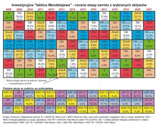 Pojawia się też pytanie co może oznaczać ubiegłoroczna relatywna słabość rynków wschodzących? Czy jest to impuls, by zwiększać zaangażowanie na emerging markets, czy może też coś w rodzaju ostrzeżenia? Ogólnie rzecz biorąc, rynki wschodzące to jedna z najbardziej zmiennych pozycji w naszym zestawieniu, która potrafi przeskakiwać z jednego na drugi koniec rankingu stóp zwrotu. Jednak to, że w 2021 emerging markets przyniosły lekką stratę, nie musi być gwarancją wyśmienitego 2022 roku. Przykładowo, po podobnie relatywnie słabym 2013 roku, w trakcie którego Fed ogłosił – tak jak na jesieni 2021 – nadchodzący koniec QE (luzowania ilościowego), kolejny rok wcale nie okazał się udany.