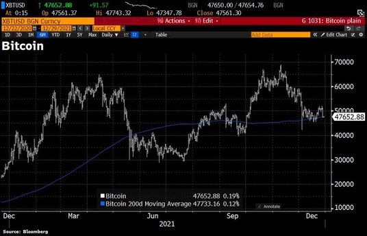 Analiza techniczna sugerują coś w rodzaju punktu krytycznego dla Bitcoina po spadku o 31 proc. z najwyższego w historii poziomu prawie 69 000 USD w listopadzie, co zmniejszyło jego roczny wzrost do prawie 70 proc. z ponad 100 proc. w szczycie. Na przykład badanie wykorzystujące wstęgi Bollingera – popularny sposób patrzenia na zmienność – pokazuje, że wirtualna waluta dotknęła górnej wstęgi w zeszłym tygodniu, ale nie zdołała zamknąć się powyżej niej. Dla niektórych oznacza to, że Bitcoin może mieć trudności z osiągnięciem zysków w krótkim okresie.