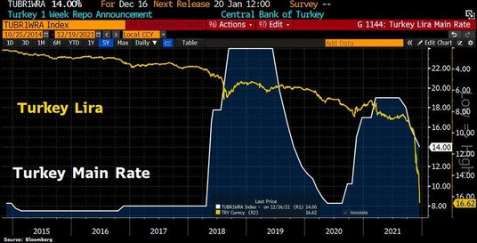 Spadek był napędzany przez łagodzenie polityki banku centralnego w ramach nieortodoksyjnego programu gospodarczego Erdogana, w ramach którego stopy obniżono o 500 punktów bazowych od września, czyniąc walutę jeszcze mniej atrakcyjną dla inwestorów i oszczędzających.