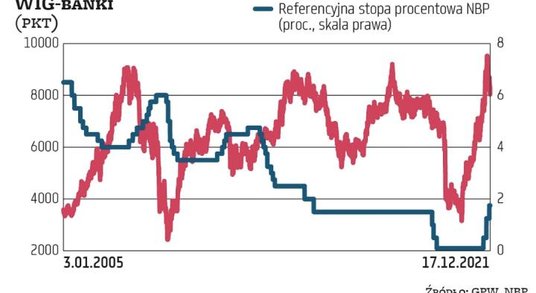 W obu przypadkach lokalny szczyt indeksu WIG-banki poprzedził koniec cyklu podwyżek. W pierwszym szczyt notowań był o osiem miesięcy przed ostatnią podwyżkę stóp. W drugim wypadł na rok przed ostatnią podwyżką stóp. Te dwa przykłady pokazują, że rynek zawczasu dyskontował zacieśnianie polityki pieniężnej i później, przynajmniej przez kilkanaście miesięcy, banki traciły. Zdaniem Marcina Materny z Millennium DM tym razem może być inaczej, przynajmniej w kilku najbliższych miesiącach. – Skala i szybkość podwyżek oraz związany z tym wpływ na finanse banków będą większe niż w trakcie poprzednich rund. W związku z bezprecedensową skalą skoku inflacji także podwyżki stóp będą wyższe niż poprzednio, RPP nie powiedziała jeszcze ostatniego słowa.
