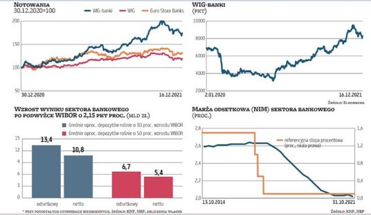 Podwyżki stóp to oczywiście wzrost wyniku odsetkowego, który odpowiada za około 70 proc. przychodów operacyjnych sektora. Dzieje się tak, bo przychody odsetkowe rosną szybciej i mocniej niż koszty tego typu. Weźmy pod uwagę ostatni wzrost WIBOR o 2,15 pkt proc. i to, że banki tuż przed wzrostem ceny pieniądza miały kredyty złotowe warte 1,1 bln zł (średnio oprocentowane 3,22 proc.) oraz 1,57 bln zł depozytów złotowych (oprocentowanie 0,06 proc.). W uproszczonym rachunku, zakładając pełne dostosowanie cen kredytów, wynik odsetkowy sektora w pierwszym roku wyższych stóp mógłby wzrosnąć o 13,4 mld zł wobec scenariusza, w którym WIBOR by nie urósł. Zysk netto wzrósłby o około 10,8 mld zł wobec wariantu bez podwyżek i bez uwzględniania innych czynników, takich jak wzrost akcji kredytowej czy kosztów ryzyka. To szacunki przy założeniu, że wyższy WIBOR w pełnym wymiarze przełożyłby się na wzrost przychodów odsetkowych, ale na koszt finansowania depozytami wpłynąłby w mniejszym stopniu – przyjęliśmy, że urosłyby o jedną trzecią. Gdyby banki „oddały" połowę wzrostu WIBOR deponentom, wynik odsetkowy urósłby o 6,7 mld zł (a zysk netto o 5,4 mld zł). Dla porównania w 2021 r. zysk netto sektora wynieść może około 13 mld zł.