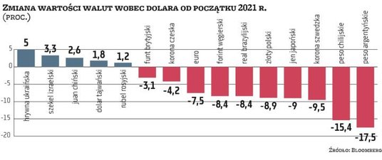 Tego, że Fed zacznie normalizować politykę pieniężną wcześniej niż inne kluczowe banki centralne świata, spodziewano się już od wielu miesięcy. To przekonanie mocno przyczyniło się do tego, że w tym roku jedynie nieliczne waluty zdołały się umocnić wobec dolara. Od początku stycznia wobec amerykańskiej waluty zyskały na wartości m.in. szekel izraelski (+3,3 proc.), juan chiński (+2,6 proc.), rubel rosyjski (+1,2 proc.) i garstka walut państw byłego ZSRR, takich jak hrywna ukraińska (+5 proc.) czy ormiański dram (+7,6 proc.).