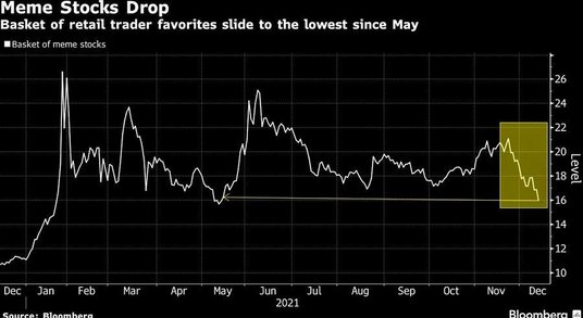Rosną straty koszyka tak zwanych akcji memów, a handlowcy odchodzą od bardziej ryzykownych aktywów w ostatnich tygodniach roku. Grupa 37 faworytów handlu detalicznego śledzona przez Bloomberga zwiększyła straty do 5,5 proc. w poniedziałek, ponieważ presja na sprzedaż na rynkach całego świata przyspieszyła. Indeks stracił prawie jedną czwartą swojej wartości w ciągu ostatnich trzech tygodni, spadając do najniższego poziomu od siedmiu miesięcy. Ryzykowne aktywa i wysoko rozwinięte firmy technologiczne znajdują się pod presją od czasu, gdy obawy związane z szczepem koronawirusa Omicron zaczęły maleć, a inwestorzy próbują ocenić kolejne ruchy Rezerwy Federalnej. Niestabilność akcji memów nie jest niczym nowym, ponieważ masowe wzrosty i gwałtowne wyprzedaże to dla tej grupy status quo.