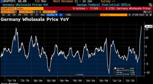 W listopadzie 2021 r. ceny sprzedaży w obrocie hurtowym wzrosły o 16,6 proc. w porównaniu z listopadem 2020 r. Od początku kalkulacji wskaźników cen hurtowych w 1962 r. nie odnotowano wyższego rocznego tempa zmian. W październiku 2021 r. i we wrześniu 2021 r. roczne stopy zmian wyniosły odpowiednio +15,2 proc. i +13,2 proc. - podał niemiecki urząd statystyczny Destatis. Od października 2021 do listopada 2021 wzrost wyniósł 1,3 proc..