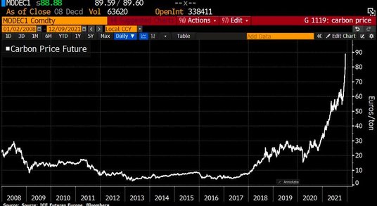 Jak twierdzą analitycy, europejska referencyjna cena emisji dwutlenku węgla do końca 2021 r. może osiągnąć 100 euro (113 USD) za tonę, po wzroście o 50 proc. od początku listopada do rekordowych poziomów dzięki rosnącym cenom gazu i zbliżającym się wygaśnięciu opcji. Benchmark emisji dwutlenku węgla pobił w środę nowy rekord w wysokości 90,75 euro.