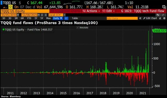 We wtorek rosły kontrakty terminowe na indeks Nasdaq 100, było to korzystne dla inwestorów, którzy zainwestowali w ETF ProShares UltraPro QQQ (znak TQQQ) w piątek. Fundusz, który wykorzystuje opcje, aby zapewnić trzykrotność wyników benchmarków, był jednym z liderów rynku na początku wtorkowych transakcji. Dane dotyczące przepływów, które mają jednodniowe opóźnienie ze względu na sposób rozliczenia funduszu pokazały, że inwestorzy ulokowali pod koniec zeszłego tygodnia bezprecedensową kwotę 1,47 miliarda dolarów. Ponad 13 miliardów dolarów w akcjach TQQQ zmieniło właściciela podczas sesji, ponieważ spadł o 5 proc.