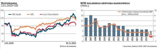 Ocenę sytuacji utrudnia pojawienie się omikronu, nowego wariantu koronawirusa, który może przyczynić się do konieczności wprowadzania ograniczeń gospodarczych ze szkodą dla kredytodawców. – Po realizacji pozytywnego dla banków scenariusza szybszych i większych, niż oczekiwano, podwyżek stóp procentowych korekta notowań była naturalna. Jednak według mnie zabrnęła ona za daleko, a wpływ pojawienia się nowej mutacji koronawirusa na perspektywy sektora bankowego został przeceniony. Kursy niektórych banków wróciły do poziomów z okresu pierwszej podwyżki stóp, tymczasem inflacja nie zwalnia. RPP stóp obniżać na pewno nie będzie, cały czas to podwyżki są bardziej prawdopodobne. Aby mówić o ryzyku dla banków, należałoby założyć, że gospodarkę czekają masowe wyłączenia jak w 2020 r., a na razie jest to założenie wątpliwe. Wprowadzane przez rząd obostrzenia są symboliczne i dotyczą tylko wycinka gospodarki – uważa Łukasz Rozbicki, zarządzający MM Prime TFI.