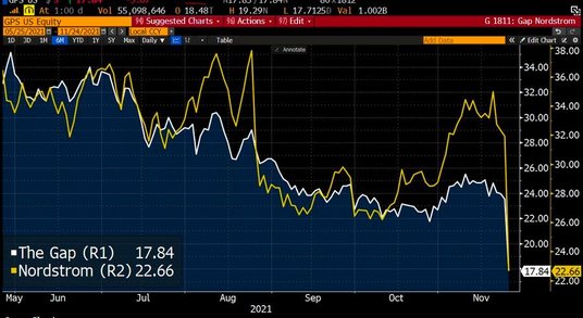 Akcje Nordstrom Inc i Gap Inc spadły w środę o ponad 20 proc., ponieważ ostrzeżenia o niedoborach produktów w kluczowym okresie świątecznym wzbudziły obawy, że detaliści przegrywają z lepiej przygotowanymi konkurentami. Grupa analityków z Wall Street obniżyła swoje ceny cenowe, a Wells Fargo prawie o połowę obniżył swoje przewidywania dla Gap i Jefferies, dokonując najbardziej agresywnych cięć w Nordstrom.