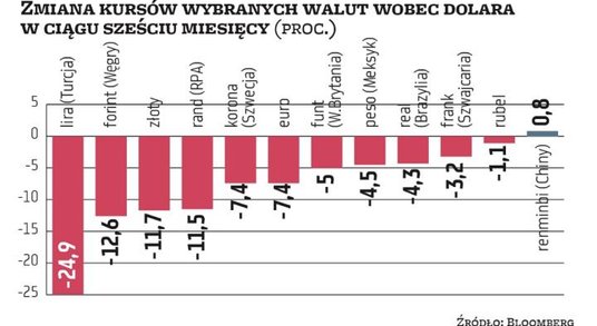 Polska waluta traci na wartości od dwóch tygodni, ale ostatnie dni były pod tym względem wyjątkowo burzliwe. W poniedziałek kurs euro chwilowo przebił 4,72 zł i znalazł się najwyżej od 2009 r. Jeszcze przed Świętem Niepodległości był o ponad 12 groszy niżej. W tym czasie spośród kilkudziesięciu najważniejszych walut bardziej osłabiła się tylko turecka lira i południowoafrykański rand. Jeszcze bardziej złoty stracił na wartości wobec dolara i franka szwajcarskiego. Za amerykańską walutę w poniedziałek było trzeba zapłacić nawet 4,18 zł, o 20 groszy więcej niż na początku listopada, a za szwajcarską – ponad 4,51 zł, o 14 groszy więcej niż na początku miesiąca.