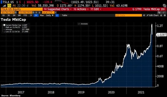 Pomimo ostatniego spadku, Tesla wciąż rośnie w tym roku o 45%, a kapitalizacja rynkowa przekracza 1 bilion dolarów, co jest kluczowym poziomem, jaki spółka osiągnęła pod koniec października. Większość tych zysków nastąpiła po tym, jak firma odnotowała dobre wyniki i liczbę dostaw za trzeci kwartał, znacznie przewyższając oczekiwania rynku, a firma wynajmująca samochody Hertz Global Holdings Inc. złożyła duże zamówienie na pojazdy Tesli do swojej floty.