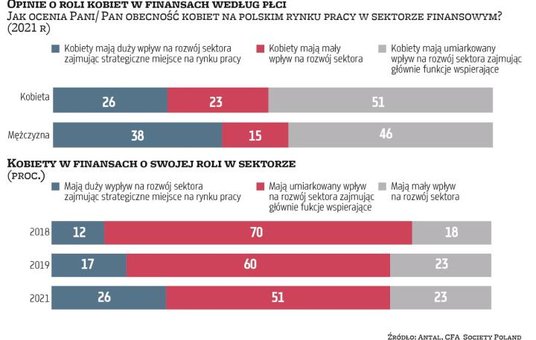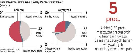 Wprawdzie w tym roku do 17 proc. (z 6 proc. w 2019 r.) zwiększyła się grupa specjalistów i menedżerów sektora finansów, którzy nie dostrzegają żadnych zewnętrznych barier hamujących aktywizację kobiet, ale jest to przede wszystkim efekt pozytywnych opinii męskiej części badanych. Co drugi z nich uważa, że nic nie ogranicza kobiecych karier. Wśród samych kobiet takich opinii jest dziesięć razy mniej, bo 5 proc. – jak wskazuje tegoroczna, trzecia edycja raportu „Kobiety w finansach" przygotowanego przez firmę rekrutacyjną Antal i CDF Society Poland.
