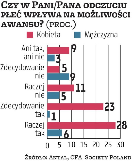 Co ciekawe, mężczyźni dużo rzadziej (15 proc.) uznają tradycyjny podział ról za barierę w karierach kobiet. Tylko 5 proc. z nich wskazuje też wśród tych barier pomijanie kobiet przy awansach – na co zwraca uwagę 16 proc. samych zainteresowanych. Panowie znacznie rzadziej dostrzegają też wpływ płci na możliwości awansu; tylko 7 proc. z nich uważa, że ma to znaczenie, podczas gdy wśród kobiet twierdzi tak ponad połowa badanych.
