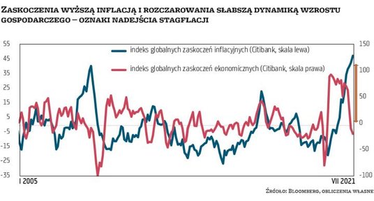 Z jednej strony inflacyjne odczyty wciąż zaskakują analityków i ekonomistów, którzy nie nadążają z podwyższaniem oczekiwań w ślad za faktycznym wzrostem cen na świecie. Z drugiej – dane pokazujące skalę wzrostu gospodarczego są coraz bardziej rozczarowujące. Po ostatnim rajdzie cen surowców energetycznych, których przełożenie na indeksy cen producentów i konsumentów jest najbardziej namacalne, coraz trudniej jest bronić tezy o przejściowym charakterze wzrostu cen. Inflacyjne konsekwencje szoków podażowych na rynku surowców czy problemów z łańcuchami dostaw może i są poza możliwością oddziaływania banków centralnych, ale ich wpływu na utrwalenie się wyższych oczekiwań inflacyjnych władze monetarne nie powinny pomijać milczeniem. Zgodnie z oficjalnym komunikatem właśnie to było głównym argumentem stojącym za ostatnią zaskakującą podwyżką stóp procentowych przez RPP.