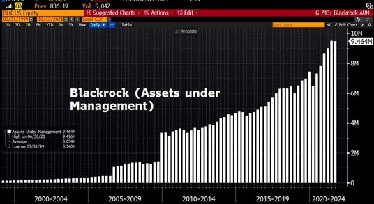 Fink powiedział, że wzrost zarządzanych aktywów BlackRock w ostatnich kwartałach „wywołuje zaskoczenie" i że ogólnie rzecz biorąc, ich ogólny udział w aktywach finansowych „wzrósł tylko nieznacznie" do niecałych 3 proc., z 2,4 proc. w momencie kupowanie iShares po kryzysie finansowym.