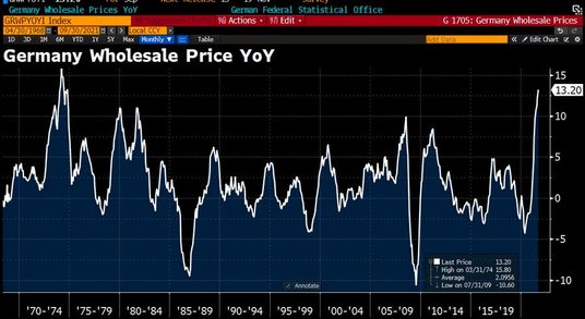 Inflacja cen hurtowych w Niemczech przyspieszyła do najszybszego od 1974 roku, jak pokazały we wtorek dane Destatis. Wzrosły we wrześniu o 13,2 proc. rocznie, po 12,3-proc. wzroście w sierpniu. Destatis poinformował, że ostatni raz wyższy wzrost niż w tym samym miesiącu poprzedniego roku miał miejsce w czerwcu 1974 roku, kiedy ceny hurtowe wzrosły o 13,3 procent w następstwie pierwszego kryzysu naftowego. Ostatni roczny wzrost był w dużej mierze spowodowany gwałtownym wzrostem wielu surowców i półproduktów. Kolejnym powodem wzrostu była niska baza porównawcza. W ujęciu miesięcznym inflacja cen hurtowych wzrosła do 0,8 proc. z 0,5 proc. w sierpniu.