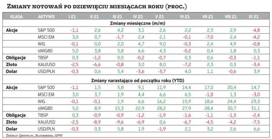 Dziewiąty miesiąc roku zgodnie ze swą złą reputacją również w tym roku okazał się mocno problematyczny dla inwestorów. Już dawno w tabeli z miesięcznymi zmianami kursów różnych aktywów nie zrobiło się tak czerwono. Dla amerykańskiego S&P 500 wrzesień okazał się zgodnie z opisywanymi przez nas statystykami sezonowymi zdecydowanie najsłabszym miesiącem od początku roku (poprzednio tak słaby rezultat odnotowaliśmy we... wrześniu 2020 r.). Znamienne jest też to, że przerwana została trwająca aż siedem miesięcy seria wzrostowa.