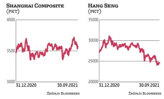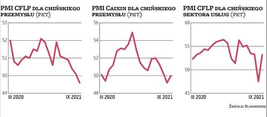 Wskaźnik PMI mierzący koniunkturę w chińskim przemyśle niespodziewanie spadł z 50,1 pkt w sierpniu do 49,6 pkt we wrześniu. Znalazł się więc na „recesyjnym" poziomie i stało się to po raz pierwszy od lutego 2020 r., czyli od wybuchu pandemii. (Każdy odczyt PMI poniżej 50 pkt mówi o kurczeniu się aktywności w danym sektorze). Średnio oczekiwano, że PMI utrzyma się na sierpniowym poziomie. To już kolejny sygnał mówiący o pogarszaniu się sytuacji gospodarczej w Chinach. Na spowolnienie gospodarcze nakłada się tam kryzys z dostawami prądu oraz kłopoty China Evergrande Group, które mogą się rozlać na cały chiński rynek nieruchomości.