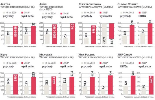 Nie brakuje spółek, które po I półroczu mogą mieć powody do zadowolenia ze swoich tegorocznych dokonań, czego najlepszym przykładem jest PKP Cargo. Wynik EBITDA tego przewoźnika kolejowego wzrósł o 27 proc., do 423 mln zł, a wynik netto po skoku o 363 proc. sięgnął 90 mln zł. Motorem napędowym wyników jest przewóz węgla i kruszyw. Skokowa poprawa skłoniła zarząd PKP Cargo do korekty całorocznej prognozy wyników. Nowe szacunki zakładają, że w 2018 r. wynik EBITDA całej grupy sięgnie 904 mln zł wobec wcześniej planowanych 778,7 mln zł (podwyżka o 16,2 proc.). Jednostkowy zysk operacyjny spółki PKP Cargo ma sięgnąć 337,3 mln zł (podwyżka o 65 proc.), a jednostkowy zysk netto 269,9 mln zł (wzrost prognozy o 67,8 proc.).