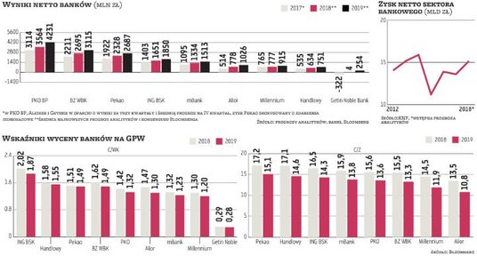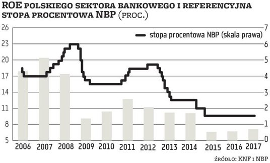 Oczekiwania rynku wobec rozpoczęcia cyklu podwyżek stóp procentowych w Polsce mają już dobre kilkanaście miesięcy. Nie pozostały bez wpływu na wyceny banków, które rosły po wyższych odczytach inflacji pod koniec 2016 r. i na początku 2017 oraz w grudniu 2017 r. O ile wcześniej spodziewano się, że do podwyżek stóp dojdzie pod koniec 2017 r., o tyle później prognozy przesunęły się na połowę 2018 r., następnie na IV kwartał 2018 r., ale najnowsze oczekiwania zakładają podwyżki dopiero w 2019 r. Sęk w tym, że na lata 2018 i 2019 analitycy prognozują dwucyfrowe tempo wzrostu zysku netto sektora bankowego. W przypadku 2018 r. problemu z wykonaniem prognozy raczej być nie powinno, bo nie zakładała jeszcze podwyżek stóp, ale oczekiwane wyniki w 2019 r., opierające się w dużym stopniu na wyższych stopach procentowych, stają się wątpliwe.