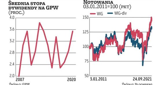 WIGdiv to indeks dochodowy i przy obliczaniu uwzględnia zarówno ceny zawartych w nim akcji, jak i dochody z dywidend i praw poboru. Na starcie dekadę temu jego wartość wynosiła 1000 pkt, ostatnio oscyluje wokół 1340 pkt, co oznacza wzrost o 34 proc. Jednak w tym samym czasie WIG zyskał 47 proc., więc okazał się o 13 pkt lepszy. Do 2015 r. oba wskaźniki osiągały niemal identyczne stopy zwrotu, lecz od tego momentu szeroki rynek zaczął zyskiwać przewagę. Częściowo za nieco niższą stopę zwrotu dywidendowego indeksu odpowiada jego struktura: jest tam więcej tych bardziej dojrzałych, mniej wzrostowych biznesów z branż (to raczej spółki typu value), które nie rosną aż tak szybko jak np. producenci gier czy przedstawiciele e-commerce (spółki typu growth). Ostatnio WIG-div nie sprzyjał też paliwowy Orlen, który ma w tym indeksie największą wagę, a jego notowania spadały. MR