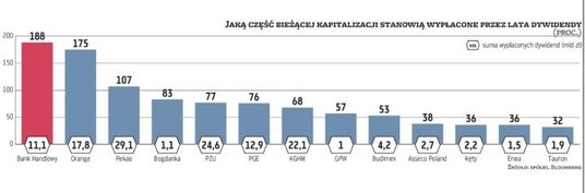 Przyjrzeliśmy się największym spółkom (z WIG20 i mWIG40), które w swojej historii wypłaciły największe skumulowane dywidendy w porównaniu ze swoją bieżącą kapitalizacją. Największy wskaźnik – niemal 190 proc. – zanotował Bank Handlowy, który wypłacił w sumie już 11,1 mld zł dywidend. Warto jednak zwrócić uwagę, że „miał na to dużo czasu", bo chodzi o 23 lata. Kluczem do sukcesu okazała się żelazna konsekwencja (tylko dwa razy nie wypłacił dywidendy, co wynikało z zakazu nałożonego przez regulatora na cały sektor bankowy) i wysoka rentowność Handlowego. Z drugiej strony wysokie dywidendy (do podziału najczęściej trafił cały zysk) były płacone kosztem wolniejszego wzrostu biznesu, inne banki przez lata znacznie mocniej zwiększyły aktywa. Wskaźnik podbił też spadek kapitalizacji banku wskutek gorszych wyników i już nie tak dużej części zysków przeznaczanych do podziału. W Pekao było podobnie. Bank ten przez 13 lat tylko dwa razy nie podzielił się zyskiem, także ze względu na regulacje. W tym czasie wypłacił akcjonariuszom aż 29,1 mld zł, co stanowi prawie 110 proc. jego kapitalizacji. Dobry wynik uzyskał też PZU – 24,6 mld zł dywidend przez 11 lat robi wrażenie, to 77 proc. jego obecnej wartości rynkowej. KGHM byłby wysoko na tej liście, gdyby nie... jego wysoka wycena. Miedziowy gigant wypłacił 22,1 mld zł dywidend, co stanowi 68 proc. jego kapitalizacji. Ta jednak ostatnio, na fali zwyżek cen miedzi i srebra, mocno się zwiększyła (105 proc. w dwa lata). To obniżyło wskaźnik.