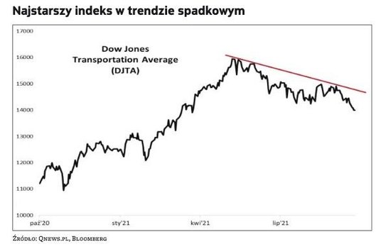 Na przysłowiowy deser zostawiliśmy jeszcze inny benchmark, należący do najbardziej klasycznych miar koniunktury Wall Street: Dow Jones Transportation Average (DJTA). Co prawda czasy swej świetności „średnia transportowa" ma już dawno za sobą, ale warto wspomnieć, że indeks ten stanowi przecież element słynnej teorii Dowa. Polega ona na tym, że jeśli DJTA podąża w innym kierunku niż siostrzany indeks „przemysłowy" (DJIA), stanowi to sygnał ostrzegawczy. Jest to o tyle interesujące, że średnia transportowa na przestrzeni ostatnich prawie pięciu miesięcy jest nie tyle nawet w trendzie bocznym, jak wymienione wcześniej benchmarki, lecz w trendzie... spadkowym. W ostatnim tygodniu indeks znalazł się najniżej od... marca (!).