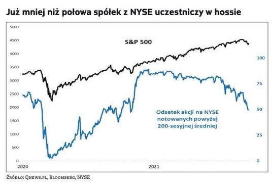 W wersji bardziej pesymistycznej systematycznie pogarszająca się szerokość rynku to efekt mieszanki czynników takich jak wysokie wyceny akcji oraz groźba postępującej zadyszki w gospodarkach (o czym szerzej pisaliśmy np. przed tygodniem). Nietrudno wyobrazić sobie, że w bardziej negatywnym scenariuszu doszłoby do pogłębienia opisywanych zjawisk. Na przykład odsetek akcji powyżej 200-sesyjnej średniej w przypadku głębszych korekt na Wall Street potrafił zjechać do poziomu zaledwie 7–12 proc. (np. w latach 2011, 2016, 2019) i dopiero wtedy dochodziło do punktu zwrotnego, czyli rozpoczynała się długotrwała poprawa.