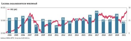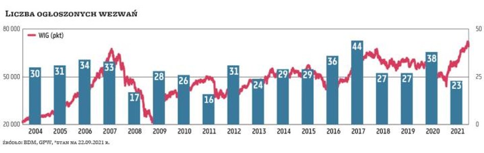 Od początku roku na GPW ogłoszono ponad 20 wezwań. Wydawać by się mogło, że wzrost indeksów i wysokie wyceny aktywów wspierają rynek IPO, a zniechęcają do ogłaszania wezwań. Tak jednak nie jest. Pomiędzy rynkiem wtórnym a pierwotnym rzeczywiście istnieje mocna korelacja (wzrost na giełdach zachęca nowe spółki do debiutów, a inwestorów do kupowania ich akcji). Dobra koniunktura wspiera też jednak rynek fuzji i przejęć, co jest widoczne również na giełdzie. Na przykład u szczytu poprzedniej hossy w 2007 r. zrealizowano ponad 30 wezwań, a w kryzysowych latach 2008–2009, gdy wyceny aktywów znacząco spadły, spadła również liczba wezwań.