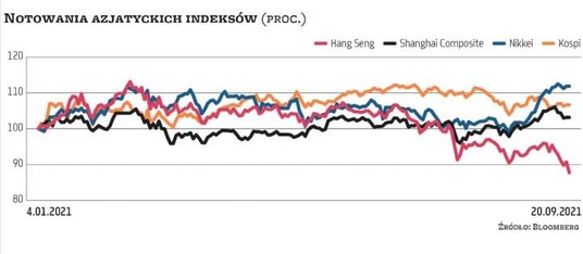 Evergrande jest najbardziej zadłużonym deweloperem na świecie. Zobowiązania spółki sięgają blisko 2 bln juanów (305 mld USD). Evergrande w ostatnich tygodniach ostrzegał, że może nie być w stanie obsłużyć swoich zobowiązań. W trakcie poniedziałkowej sesji notowania spółki spadały nawet o 19 proc. i znalazły się na najniższym poziomie od 2010 r. Ostatecznie notowania spadły o blisko 11 proc., do 2,28 HKD.