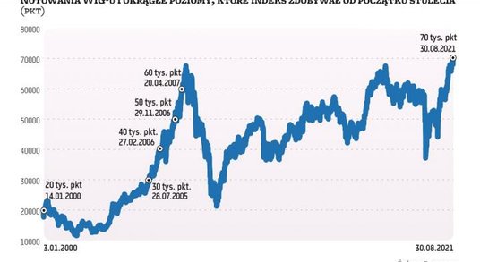 Prof. Krzysztof Borowski ze Szkoły Głównej Handlowej w Warszawie wskazuje, że przyjmując obecne tempo wzrostu (od marca 2020 r.), poziom 80 tys. pkt powinien zostać osiągnięty na przełomie 2021 i 2022 r. – Należy jednak pamiętać, że w czasie hossy indeksy lubią wchodzić na hiperbole wzrostowe i wówczas taki poziom możemy zobaczyć znacznie wcześniej, np. już w październiku – dodaje Borowski.