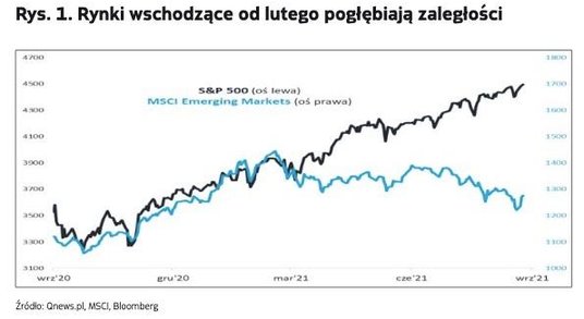 Indeks rynków wschodzących, który począwszy od pandemicznego krachu w marcu 2020 aż do lutego br. rósł solidarnie zarówno z amerykańskim S&P 500, jak i ogólnie z bezpośrednio porównywalnym indeksem rynków rozwiniętych, od tego czasu pozostaje coraz bardziej w tyle. Kilka dni temu znalazł się nawet na poziomie najniższym od... grudnia ub.r., jednocześnie powiększając skalę przeceny od lutowego szczytu do 15 proc. (w ostatnim tygodniu zaczął odrabiać straty).