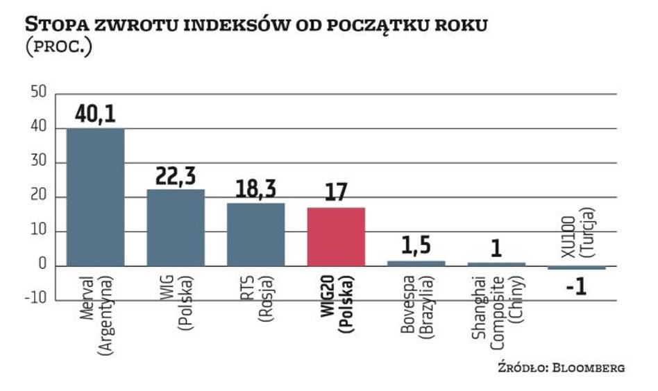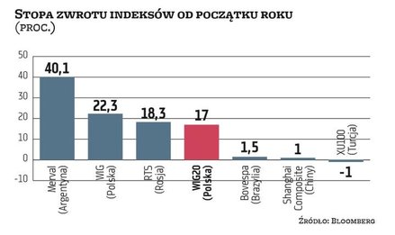 WIG jest również jednym z lepszych indeksów na rynkach wschodzących pod względem stopy zwrotu. Polski benchmark zdeklasował takie indeksy jak m.in. brazylijska Bovespa, chiński Shanghai Composite czy turecki XU100.