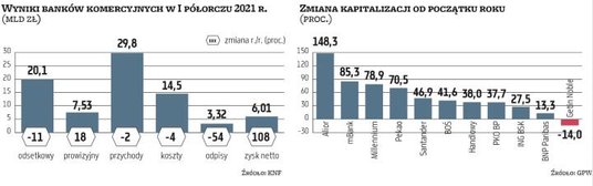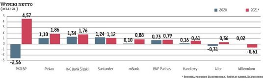 Wspólnym mianownikiem wspomnianych banków jest to, że nie mają istotnego portfela hipotek frankowych lub w dużym stopniu objęli go rezerwami. Rezerwy banków mających te kredyty dołują ich zyski. Santander według prognoz zanotuje w tym roku 1,12 mld zł zysku wobec 1,24 mld zł rok temu, po I półroczu ma 370 mln zł zarobku. BNP Paribas może wypracować 790 mln zł zysku netto, czyli nieco więcej niż w 2020 r. (po sześciu miesiącach zarobił prawie 300 mln zł). mBank może osiągnąć 880 mln zł zysku w porównaniu z zaledwie 100 mln zł w 2020 r., po I półroczu ma blisko 430 mln zł zarobku. Millennium według prognoz ma zanotować 600 mln zł straty (w 2020 r. był symbolicznie na plusie), po półroczu ma ponad 500 mln zł straty.