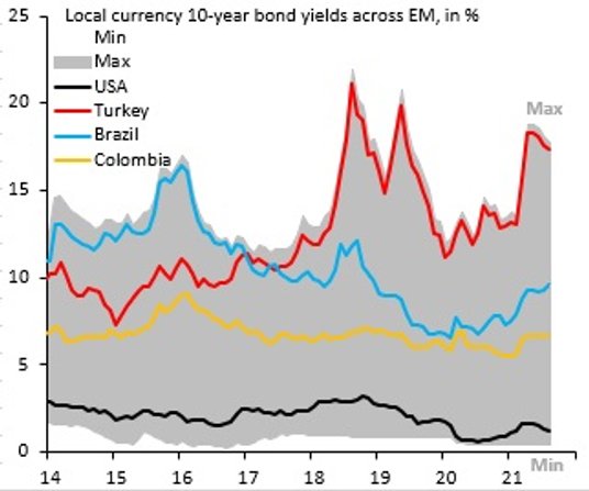 Rosnące stopy zwrotu z obligacji rynków wschodzących „mogą również dawać wiatr w żagle lokalnym walutom rynków wschodzących, które pozostają na historycznie zaniżonym poziomie. Wiele banków centralnych na rynkach wschodzących wyprzedza Rezerwę Federalną (Fed) dzięki podwyżkom stóp procentowych i chociaż stopy zostały skorygowane w górę, nie było żadnych lokalnych napadów złości, ponieważ rynek przyjął te ruchy ze spokojem" - mówi Fran Rodilosso, w VanEck szef zarządzania portfelem ETF o stałym dochodzie.