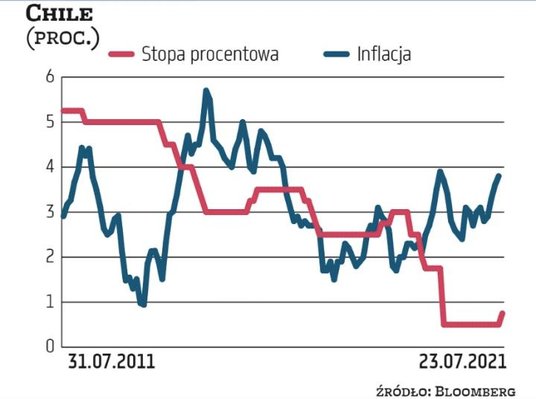 W połowie lipca do pierwszej podwyżki doszło także w Chile. Chociaż inflacja znajduje się w paśmie dopuszczalnych odchyleń od celu inflacyjnego wynoszącego 3 proc., to gwałtowne ożywienie popytu (wzrost sprzedaży detalicznej w maju o 72,1 proc., a w czerwcu prawie o 66 proc.), poprawa na rynku pracy oraz napięcia podażowe wspierają początek stopniowego procesu normalizacji polityki pieniężnej. W tym kraju ponad 72 proc. mieszkańców przyjęło co najmniej jedną dawkę szczepionki, a w pełni zaszczepionych jest ok. 65 proc. obywateli. Dominującą szczepionką jest chiński CoronaVac produkowany przez firmę Sinovac. Pomimo dużego sukcesu programu szczepień nie udało się uniknąć kolejnego lockdownu w połowie czerwca spowodowanego rozprzestrzenianiem się wariantu gamma (wykrytego po raz pierwszy w Brazylii). Wpływ kolejnych obostrzeń na aktywność ekonomiczną jest jednak ograniczony.