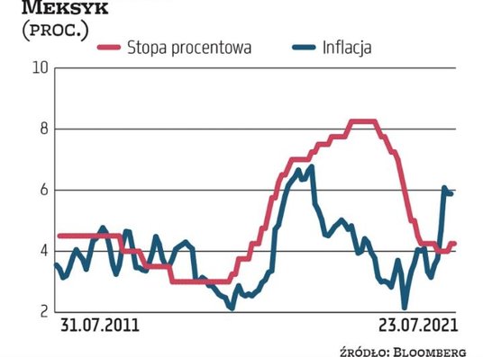 Normalizacja polityki pieniężnej nie ominęła także krajów Ameryki Łacińskiej. Pierwsze decyzje mają już za sobą Meksyk, Brazylia i Chile. Zaskoczeniem dla analityków rynkowych był wzrost głównej stopy procentowej w Meksyku miesiąc temu z 4 proc. do 4,25 proc. Inflacja w kraju Azteków zbliża się do 6 proc., a więc dwukrotnie więcej, niż wynosi cel inflacyjny. Ekonomiści zwracają jednak uwagę, że prawdopodobnie nie jest to początek cyklu zacieśniania polityki pieniężnej w drugiej największej gospodarce Ameryki Łacińskiej. Choć presja inflacyjna powinna ustąpić pod koniec roku, to analitycy ankietowani przez Bloomberga oczekują, że na koniec grudnia wskaźnik CPI wyniesie 4,9 proc. Nie są też wykluczone kolejne ruchy meksykańskiego banku centralnego mające przeciwdziałać presji cenowej.
