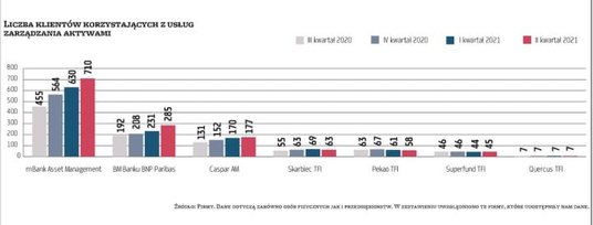 Ubiegłe 12 miesięcy przypadło na okres rewelacyjnej koniunktury na rynkach akcji, stąd stopy zwrotu niemal wszystkich strategii asset management, tj. portfeli inwestycyjnych dla zamożnych klientów banków, domów maklerskich czy towarzystw funduszy inwestycyjnych, były dodatnie. Najbardziej ryzykowne portfele przyniosły dwucyfrowe stopy zwrotu, przekraczające w kilku przypadkach nawet 50 proc. Słabiej w tym okresie wypadły inwestycje w papiery dłużne, ze względu na wzrost rentowności obligacji skarbowych. Drugi kwartał tego roku okazał się też udany. Główne indeksy akcji na świecie wspinają się co chwila na kolejne rekordy. Dobrze radzi sobie także GPW. Przypomnijmy, że w czerwcu WIG, indeks szerokiego rynku, zdołał wzbić się na najwyższy poziom w historii.