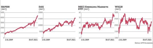 Na głównych giełdach naszego kontynentu nastroje nie były tak dobre jak za oceanem. Niemiecki DAX zniżkował do czwartku o 0,2 proc., a cały lipiec podsumował wzrostem o 0,7 proc. Na parkiecie we Frankfurcie panowała w mijającym miesiącu spora zmienność. Zdecydowanie lepiej radził sobie w ostatnich dniach paryski CAC40, zwyżkując o 1 proc., a w całym miesiącu prawie o 2 proc. Londyński FTSE 250 rósł odpowiednio o 0,7 i 3 proc. Osłabienie dolara i odreagowanie mocnej przeceny części chińskich spółek dało trochę oddechu wskaźnikowi rynków wschodzących. ETF na MSCI Emerging Markets, który momentami straszył zejściem poniżej 50 pkt, ostatecznie spadł o 0,8 proc. Lipiec był dla niego najgorszym miesiącem od czasu pandemicznego tąpnięcia z ubiegłego roku, przynosząc spadek o 5,5 proc. Sytuacja na rynkach wschodzących była jednak dość zróżnicowana. Obejmowanie przez chińskie władze różnego rodzaju ograniczeniami i restrykcjami coraz liczniejszej grupy firm i kolejnych branż doprowadziło do silnych spadków. Indeks w Hongkongu zniżkował do czwartku prawie o 6 proc., a chwilami spadek był jeszcze głębszy. Shanghai Composite tracił 4,5 proc., a w całym miesiącu 5,5 proc. „Chiński syndrom" nie dotknął w najmniejszym stopniu parkietów naszego regionu, które w większości przypadków radziły sobie całkiem dobrze. Giełdy w Turcji i Rosji zwyżkowały po około 3 proc., a na Węgrzech zwyżka sięgała niecałe 2 proc.