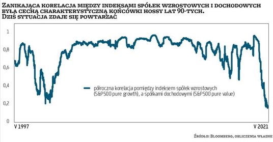 Tak wyglądało też przekazanie pałeczki między zwycięskimi branżami hossy lat 90. ubiegłego stulecia i początku XXI wieku. Podobny proces zaczął się dziesię miesięcy temu. Od tego momentu korelacja między indeksami spółek wzrostowych i dochodowych zaczęła zanikać, co jest dość rzadkim zjawiskiem, po raz ostatni występującym właśnie w latach 1998–2000. Dwie dekady temu jego kulminacją był spektakularny wystrzał i równie spektakularny upadek indeksu Nasdaq. Tych elementów wciąż brakuje w obecnej układance. Do czerwcowej rozprawy z mitem wielkiej rotacji przyczyniły się także czynniki, które wywołały wzrost wartości dolara, korektę cen surowców i spłaszczenie krzywej dochodowości. W takich warunkach sektor bankowy i surowcowy oraz wiele spółek przemysłowych musiało uznać wyższość firm technologicznych. Pojawiły się także pierwsze artykuły (np. autorstwa Nouriela Roubiniego) sugerujące nadejście zjawiska łączącego podwyższoną inflację z rozczarowującym wzrostem gospodarczym. Scenariusz stagflacji, który ma potencjał stać się głównym wątkiem w dyskusjach inwestorów w drugiej połowie roku, może wpłynąć na dalsze rozbicie rynkowego konsensusu co do przewagi spółek finansowych oraz przemysłowych i generalnie segmentu spółek value nad firmami technologicznymi. Jak pokazuje historia, stagflacja stanowi też realne zagrożenie dla trwałości hossy i gospodarczej ekspansji. Była tematem na przełomie 2000 i 2001 r., jak i w pierwszej połowie 2008 r., w obu przypadkach przepowiadając nadejście recesji.