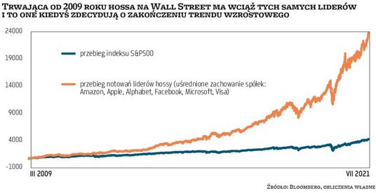 Jak to często bywa przy tak jednostronnym nastawieniu inwestorów i konsensusie wspierającym spółki typu value kosztem wzrostowych (szczególnie technologicznych), w ciągu ostatnich kilku tygodni rynek zachował się inaczej, niż obstawiała większość. Firmy technologiczne przeprowadziły udany kontratak, który pozwolił na ustanawianie przez Nasdaq kolejnych rekordów na co drugiej sesji w ciągu ostatnich czterech tygodni. Spółki wzrostowe zdominowały dochodowe, kwestionując powszechne przekonanie o wielkiej rotacji między sektorami i o długoterminowym charakterze tego procesu. W trwającej od 2009 r. hossie na Wall Street pierwsze skrzypce grały spółki wzrostowe i technologiczne. Dlatego moim zdaniem dopiero zakończenie całego rynku byka może stać się fundamentem pod prawdziwą, długoterminową zmianę liderów.