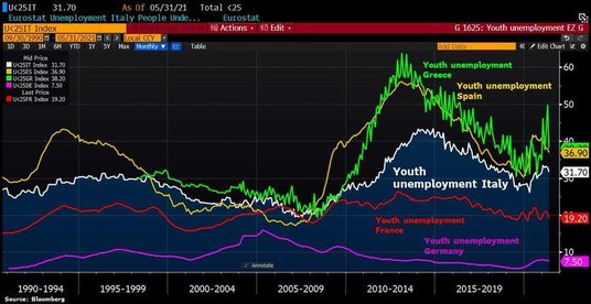 We Włoszech po pandemii nastąpiło znaczne spowolnienie gospodarcze, a PKB kraju spadł o prawie 9 proc. Bezrobocie wśród młodzieży w tym kraju wynosiło w 2020 r. 30 proc., co było jednym z najwyższych wskaźników w Europie. Pandemia doprowadziła również do jeszcze większego spadku liczby urodzeń w kraju, który już cierpiał z powodu kryzysu demograficznego. Tylko w 2020 r. populacja kraju spadła o prawie 400 000 osób, ponieważ liczba zgonów przewyższała liczbę urodzeń. W Holandii nowe dane pokazują, że bezrobocie wśród młodych ludzi w Amsterdamie wzrosło pod koniec 2020 r., kiedy spowodowane koronawirusem blokady oznaczały zamknięcie barów i restauracji. W ostatnim kwartale 2019 roku było bezrobotnych 6,5% młodych ludzi w wieku od 18 do 26 lat, w porównaniu z 9,9% w tym samym okresie w 2020 roku. Według rady miejskiej najbardziej poszkodowani byli ci pracujący w sektorze hotelarskim.